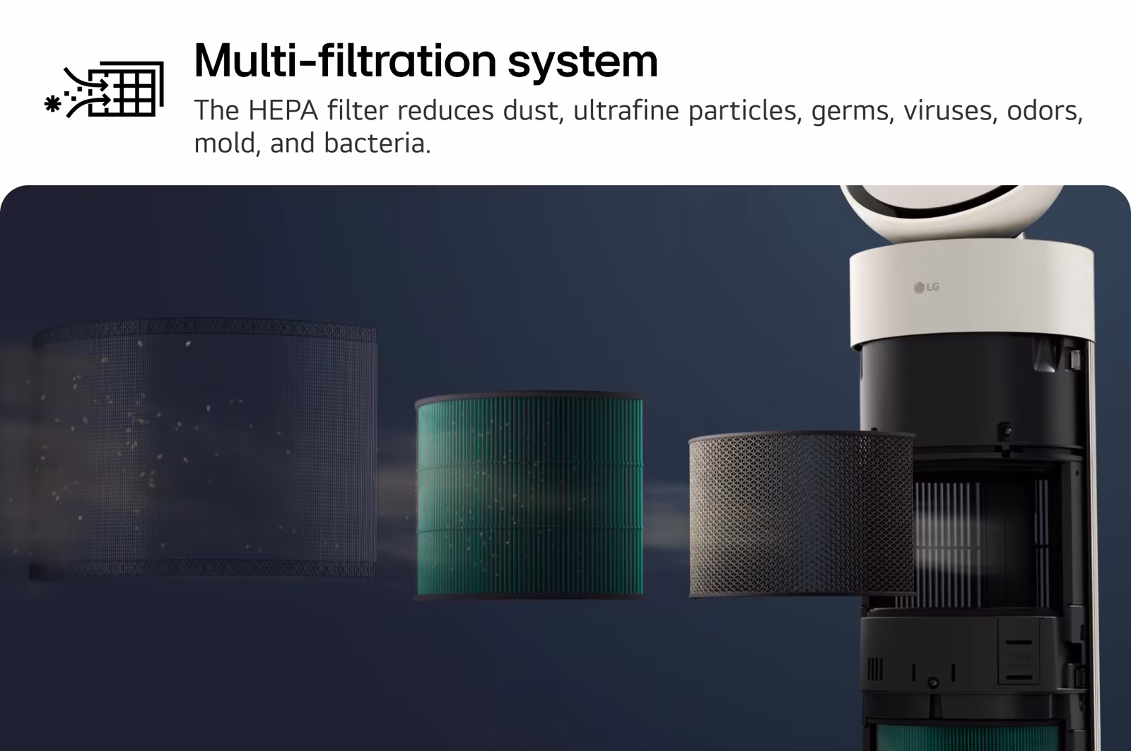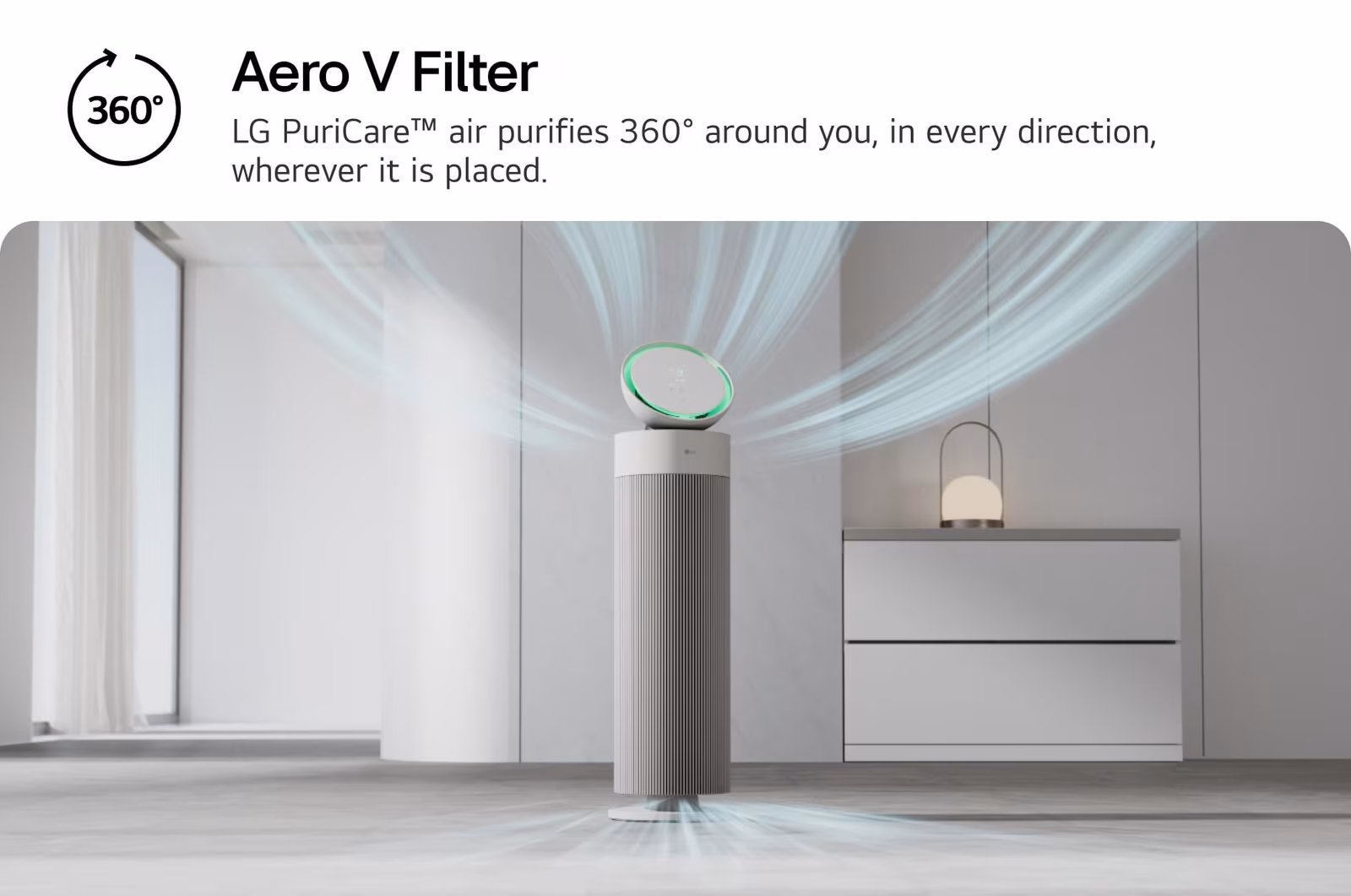 The AeroBooster is a slim, tower-style LG air purifier with 360° airflow and a Clean Booster that throws purified air up to 7.5 metres across the room. Dual H13 HEPA filters plus UVnano sterilisation tackle ultra-fine dust, allergens and gases, and BAF certification makes it a fit for allergy-sensitive households.AeroBooster ialah penulen udara LG gaya menara yang nipis dengan aliran udara 360° dan Clean Booster yang menghantar udara tulen sehingga 7.5 meter merentasi ruang. Dua penapis H13 HEPA ditambah dengan pensterilan UVnano menangani habuk sangat halus, alahan dan gas, dan persijilan BAF menjadikannya pilihan untuk keluarga yang sensitif kepada alahan.