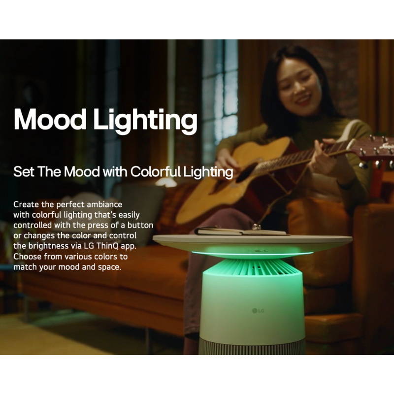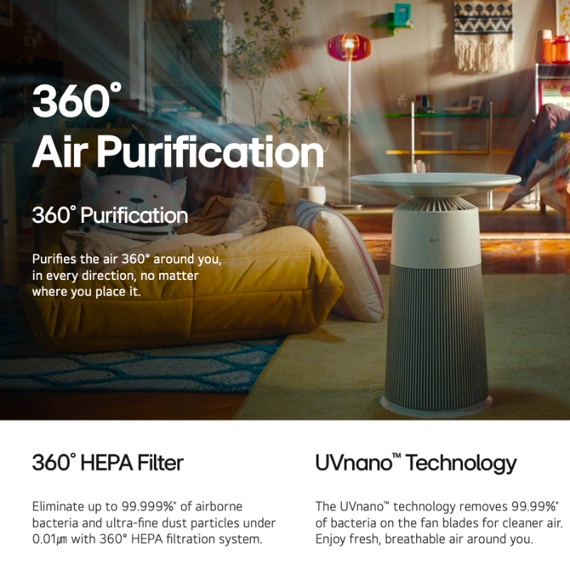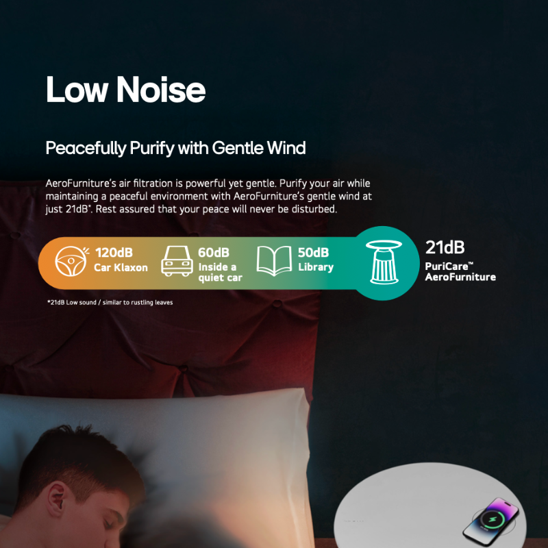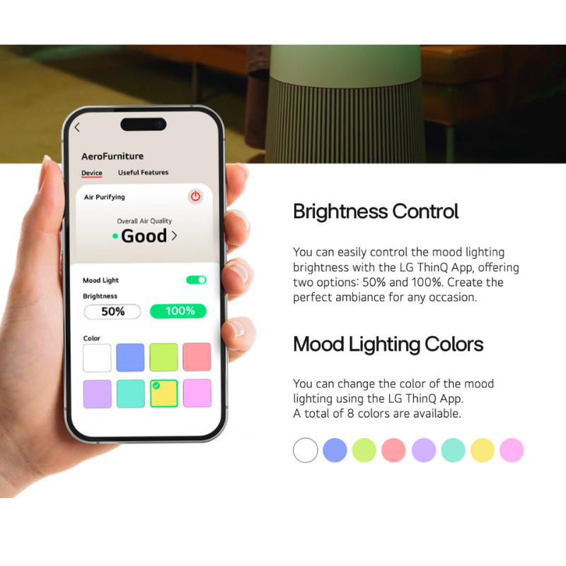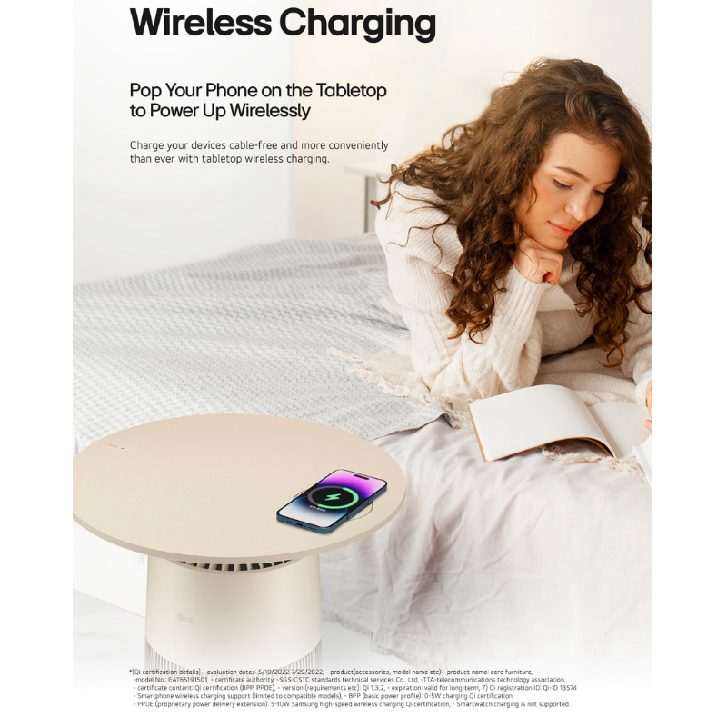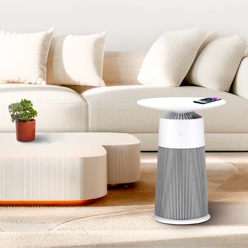 AeroFurniture is a compact LG air purifier shaped like a chic side table — perfect for small apartments where floor space is precious. It filters 360 degrees through an H13 HEPA filter, charges your phone wirelessly on its top surface, and sets the mood with ambient lighting controlled through LG ThinQ.AeroFurniture ialah penulen udara LG yang padat berbentuk meja sisi yang bergaya — sesuai untuk apartmen kecil yang menjimatkan ruang lantai. Ia menapis 360 darjah menerusi penapis H13 HEPA, mengecas telefon anda secara tanpa wayar di bahagian atasnya, dan mencipta suasana dengan pencahayaan ambien yang dikawal melalui LG ThinQ.