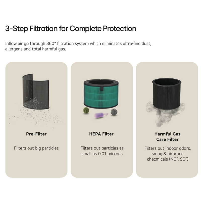 - 360° H13 HEPA filtration for rooms up to 19.8 m²Penapisan 360° H13 HEPA untuk ruang sehingga 19.8 m²