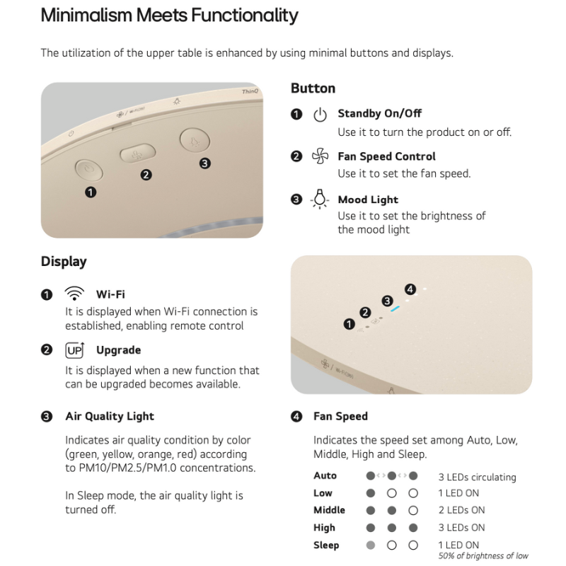 Built-in Wi-Fi lets you manage modes and see air quality from the ThinQ app anywhere.Wi-Fi terbina dalam membolehkan anda mengurus mod dan melihat kualiti udara dari aplikasi ThinQ di mana sahaja.