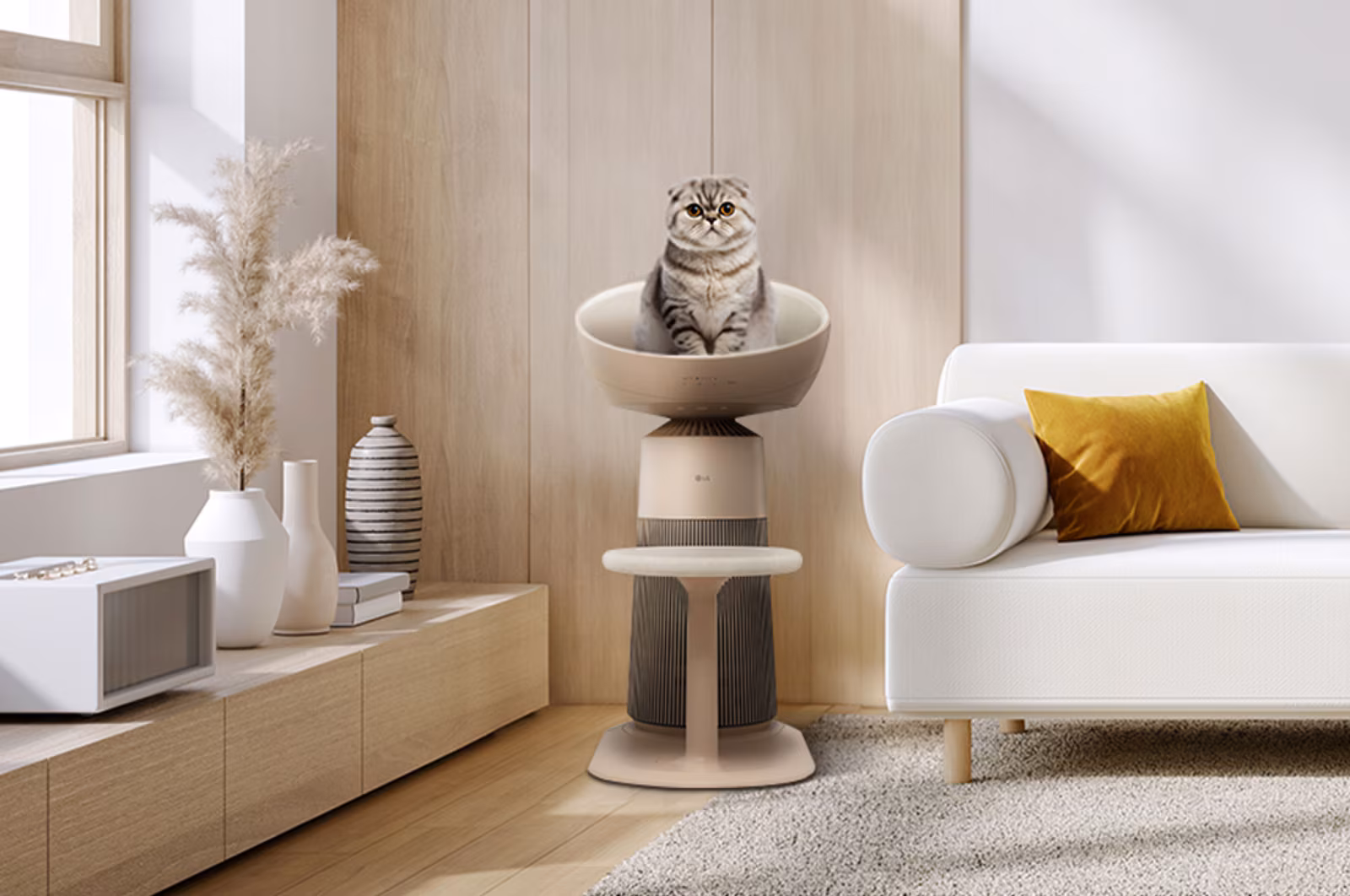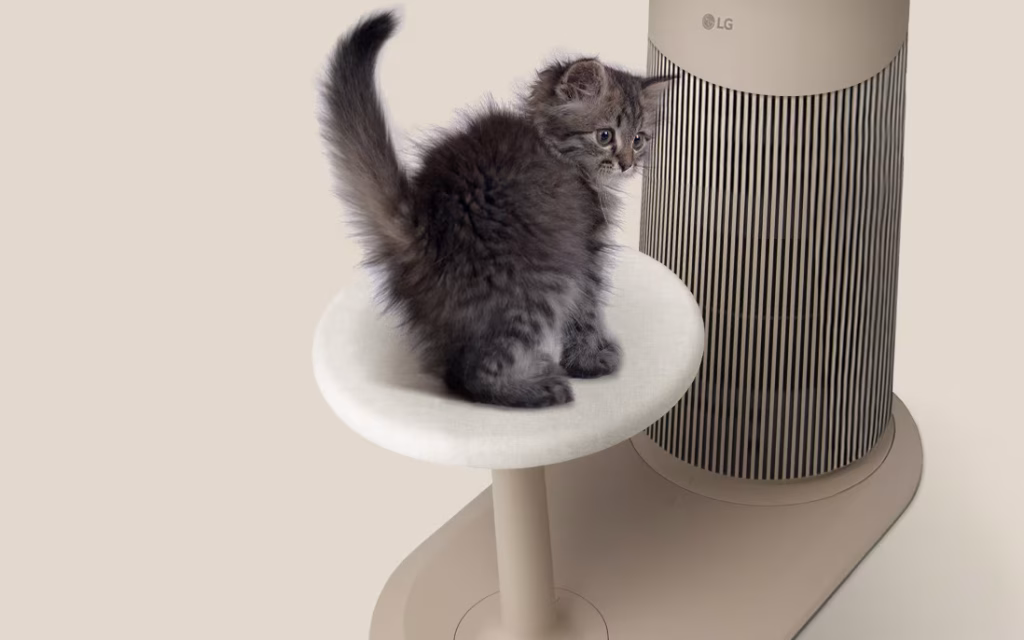 The AeroCatTower pairs powerful LG air purification with a heated lounging dome made for your cat. It cleans the air around pet-friendly homes while giving your cat a calm, warm retreat, and a Pet Care mode tracks their weight and rest through the LG ThinQ app.AeroCatTower menggabungkan penulenan udara LG yang berkuasa dengan kubah santai bertenaga haba yang direka untuk kucing anda. Ia membersihkan udara di rumah mesra haiwan sambil memberi kucing anda tempat rehat yang tenang dan hangat, dan mod Pet Care menjejak berat badan serta waktu rehat mereka melalui aplikasi LG ThinQ.