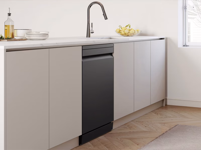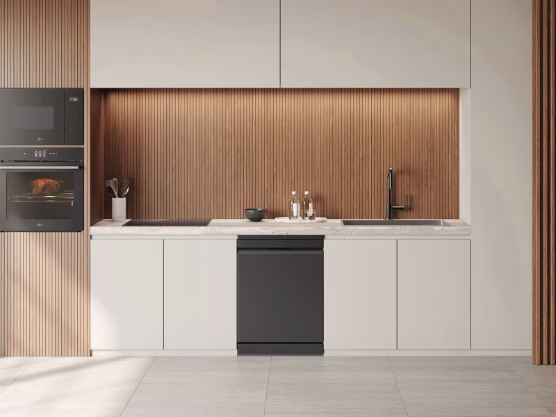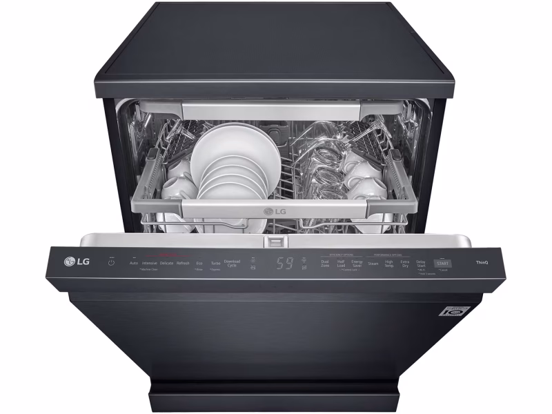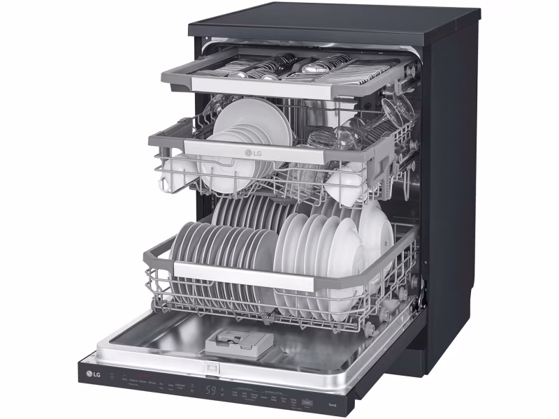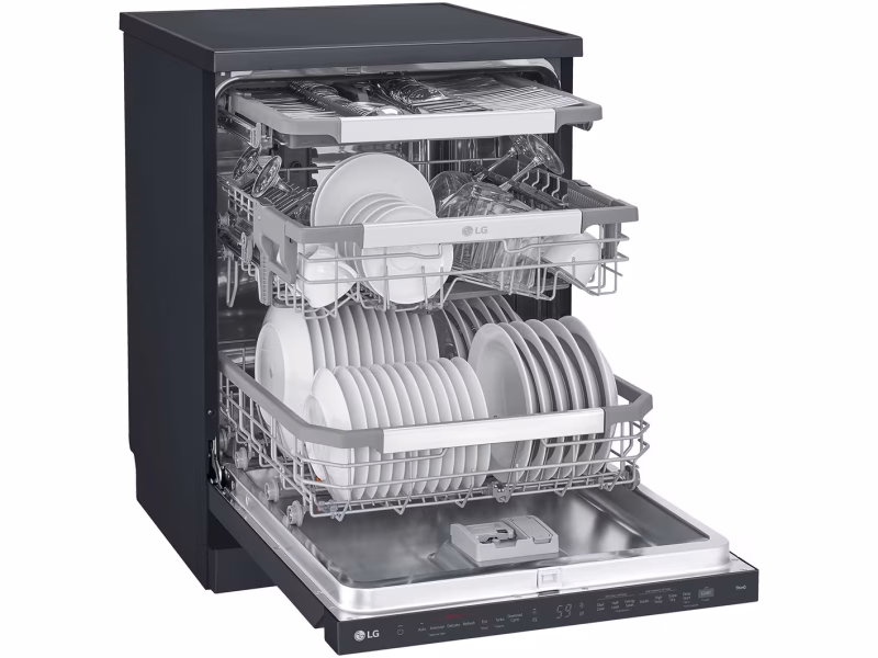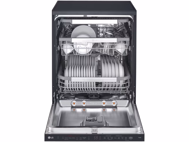 14-place matte black freestanding dishwasher with TrueSteam, QuadWash and LG ThinQ.Mesin basuh pinggan berdiri bebas 14-tempat matte black dengan TrueSteam, QuadWash dan LG ThinQ.