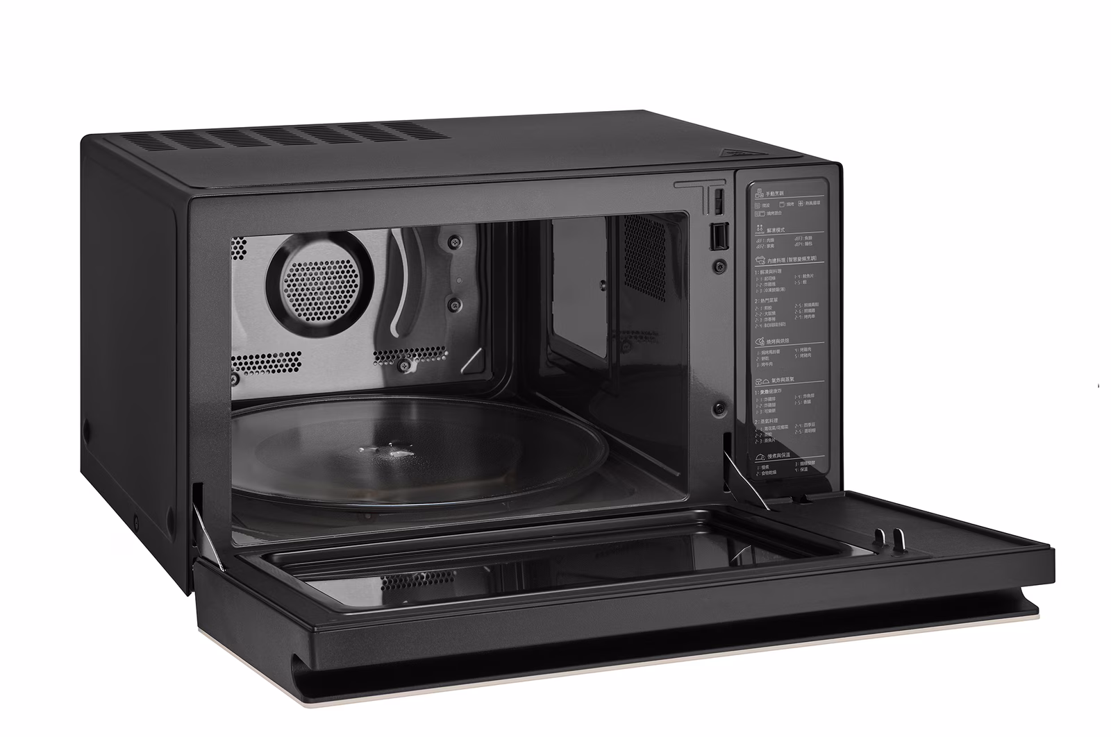 The oversized interior swallows large dinner plates and family casserole dishes without crowding — useful for reheating leftovers for the whole table.Bahagian dalaman yang besar memuatkan pinggan makan besar dan hidangan kaserola bersaiz keluarga tanpa sesak — berguna untuk memanaskan semula sisa makanan bagi seluruh keluarga.