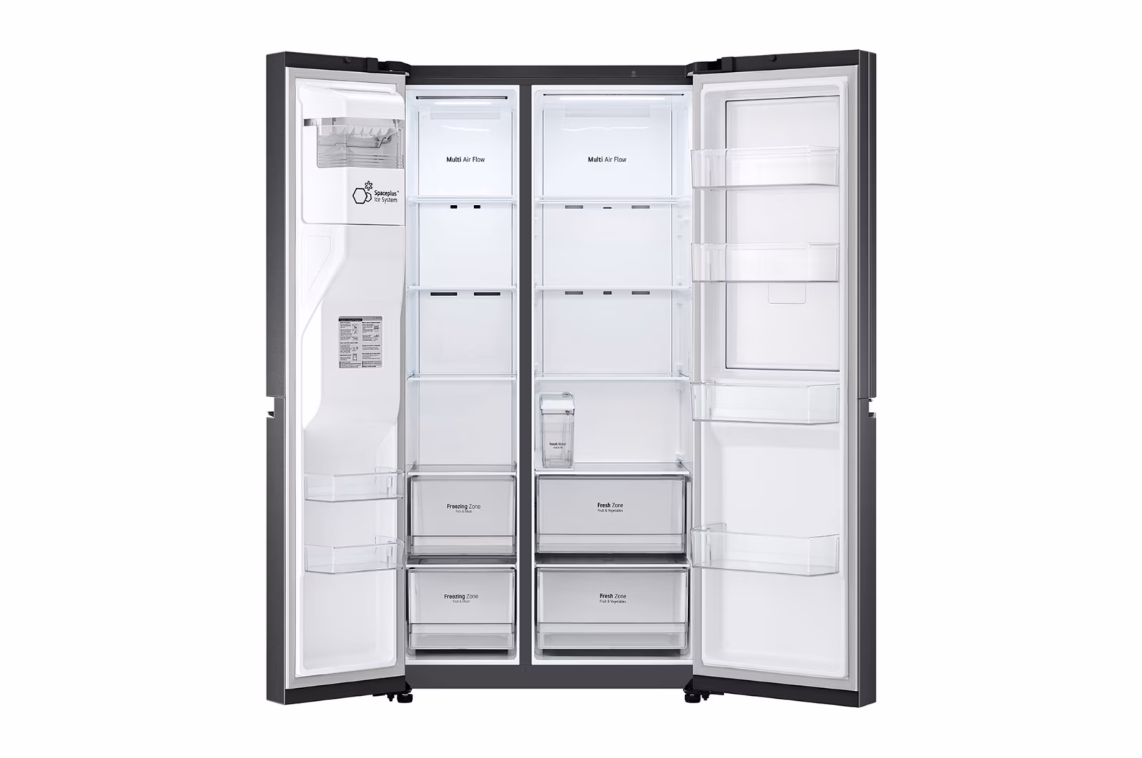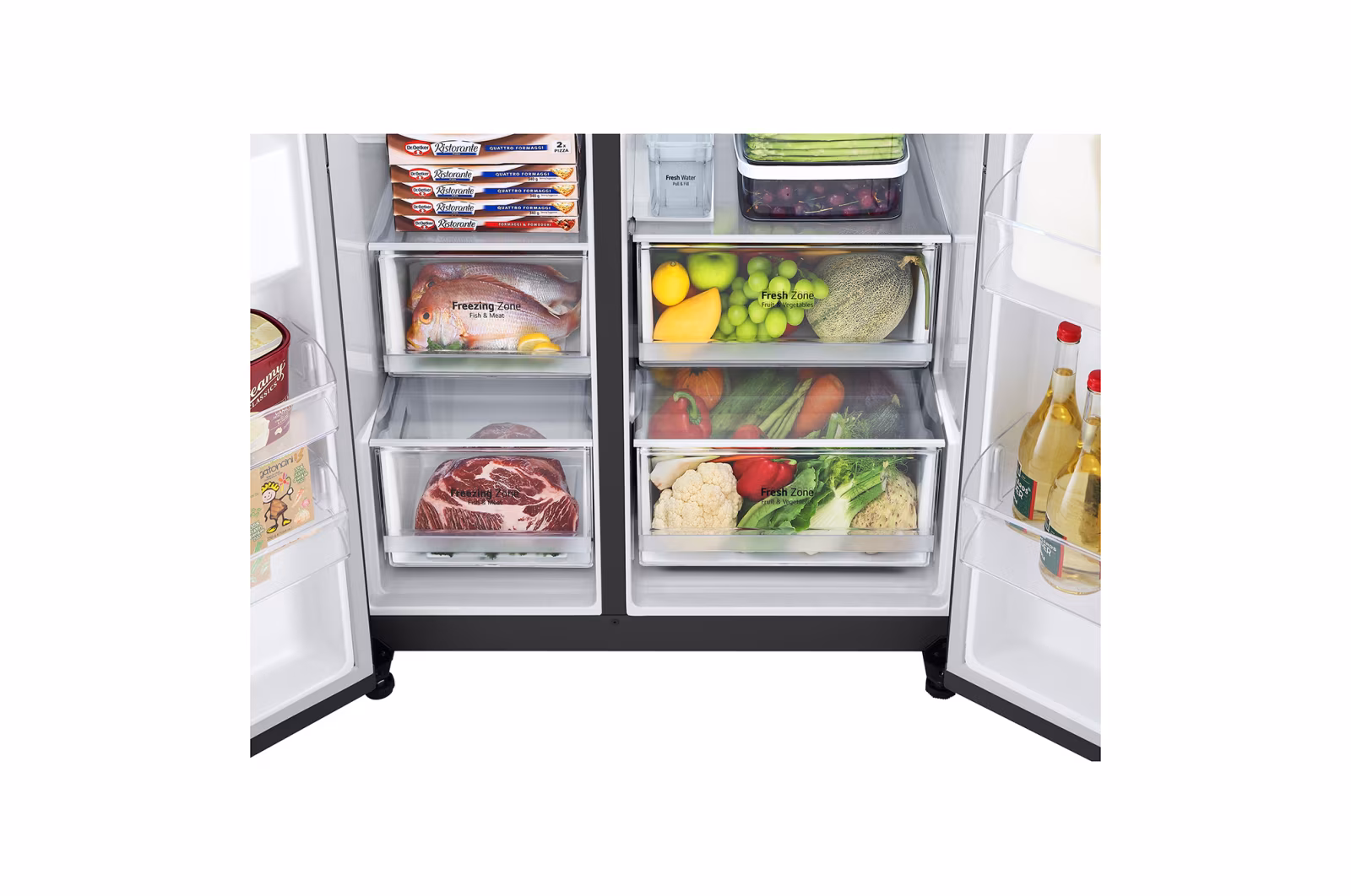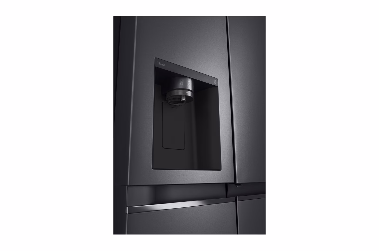 635 L side-by-side in matte black with Door-in-Door, Linear Cooling and UVnano water dispenser.Side-by-side 635 L dalam matte black dengan Door-in-Door, Linear Cooling dan penyalur air UVnano.