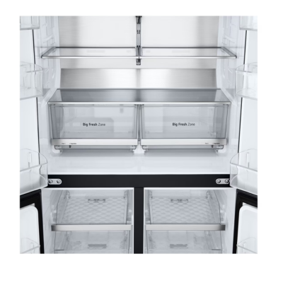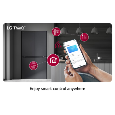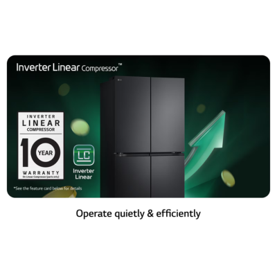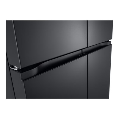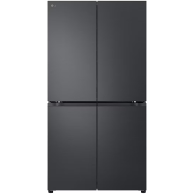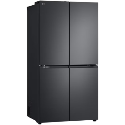 A 665 L French door fridge in matte black with a flat pocket-handle front and a black glass InstaView panel. Runs on an Inverter Linear Compressor with a 10-year parts warranty and connects to LG ThinQ.Peti sejuk French door 665 L dalam matte black dengan bahagian hadapan rata bergagang poket dan panel InstaView kaca hitam. Berjalan pada Inverter Linear Compressor dengan waranti alat ganti 10 tahun dan bersambung ke LG ThinQ.