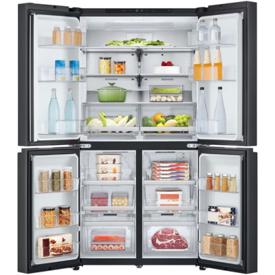 665 L French door fridge in matte black with black glass InstaView and Inverter Linear Compressor.Peti sejuk French door 665 L dalam matte black dengan InstaView kaca hitam dan Inverter Linear Compressor.