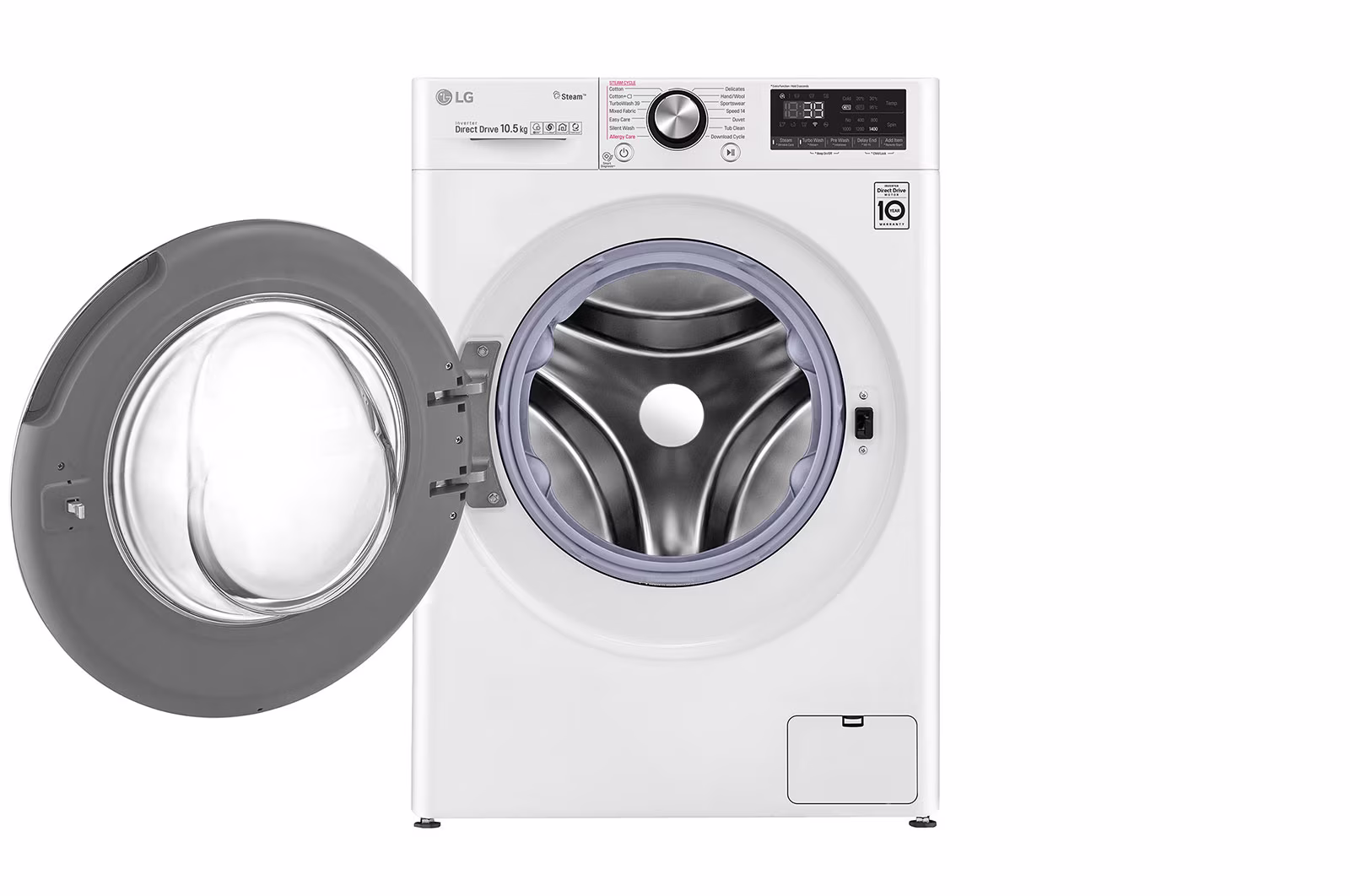 10.5 kg front loader with AI Direct Drive, TurboWash 360 and Steam+ allergy care.Mesin basuh front load 10.5 kg dengan AI Direct Drive, TurboWash 360 dan penjagaan alahan Steam+.