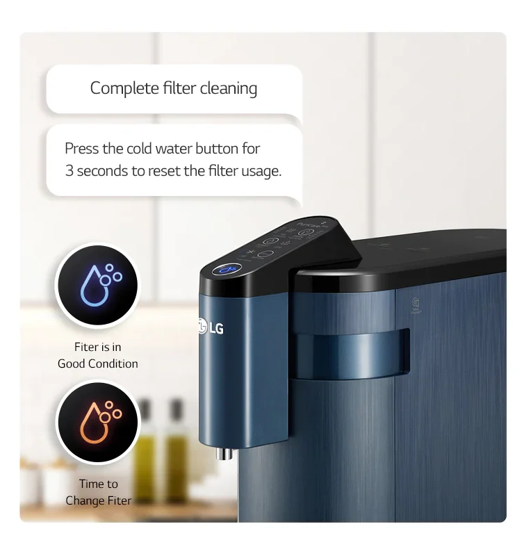 The LG PuriCare 4-WARD+ is a slim 17 cm self-service tankless water purifier that dispenses hot, cold and ambient water on demand. A 4-stage Ultra Filtration system, UV-LED sterilisation and stainless steel internal piping keep every pour clean, while voice guidance and filter change alerts make maintenance effortless.LG PuriCare 4-WARD+ ialah penulen air tanpa tangki pengesanan sendiri yang nipis 17 cm yang menghidangkan air panas, sejuk dan suhu bilik atas permintaan. Sistem Ultra Filtration 4 peringkat, pensterilan UV-LED dan paip dalaman keluli tahan karat memastikan setiap tuangan bersih, sementara panduan suara dan amaran penggantian penapis menjadikan penyelenggaraan mudah.